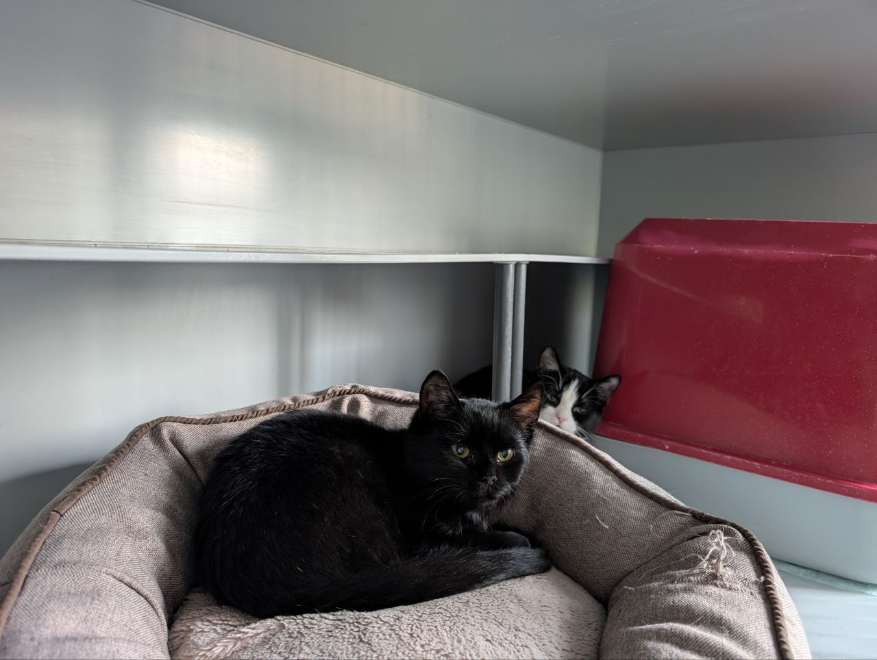 Groby und Gregor wurden an der Grünertalstr. in Iserlohn eingefangen. Sie wurden wahrscheinlich draußen geboren. Dementsprechend treten sie Menschen erstmal etwas misstrauisch gegenüber. Aber mit Liebe, Geduld und Spucke bekommt man die Zwei bestimmt noch zahm.🥰